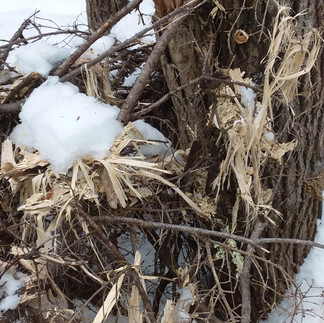 Along the White Pine trail, heading west from the access road, you will find the fine chisel work of a Pileated Woodpecker. The strips of bark hanging over the bushes are similar to what the squirrels use in building their nests, called dreys. This week, as I walked the trail, a hairy woodpecker was chipping away on an old pine tree in search of protein-rich insect food. The sound echoed loudly in the otherwise nearly silent landscape.
